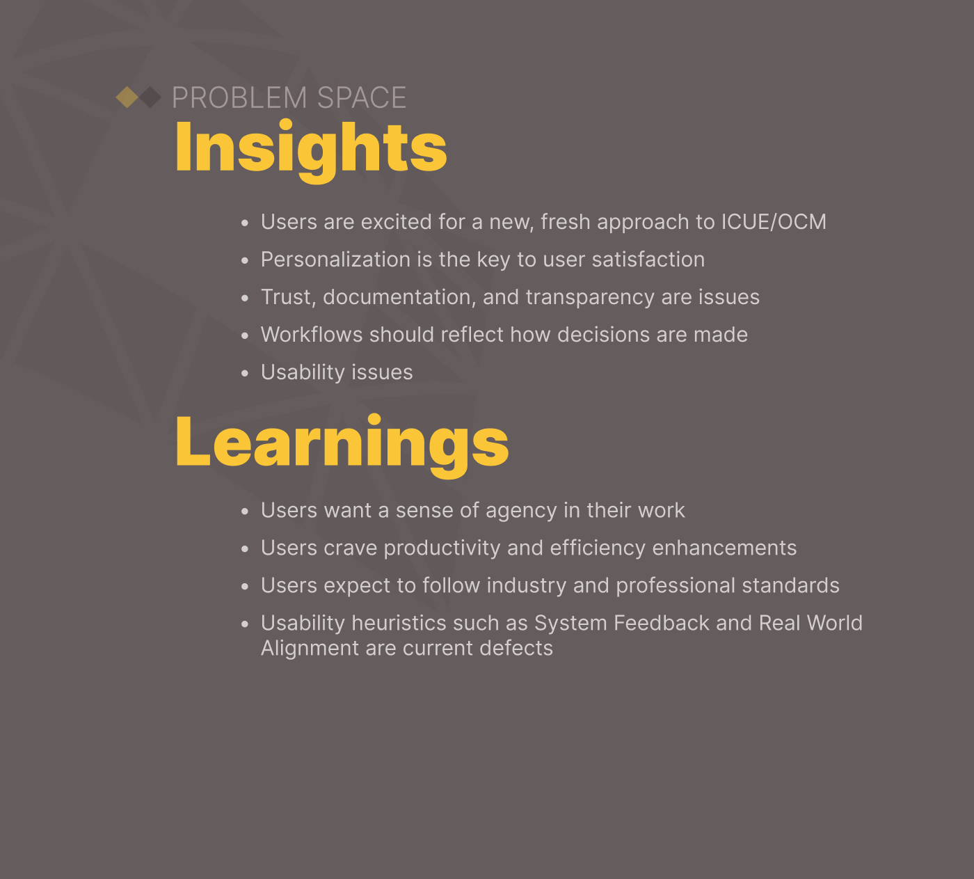 I conducted user research with our three primary user personas/archetypes. Based on the findings, I created new workflows, information architecture, and design recommendations.