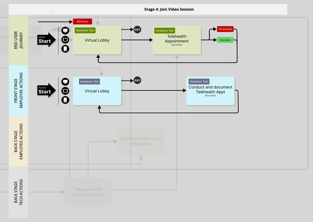 Our team was responsible for user research resulting in a service blueprint mapping front-end and back-end experiences. I was responsible for the appointment experience in Stage 4: Join Video Session.