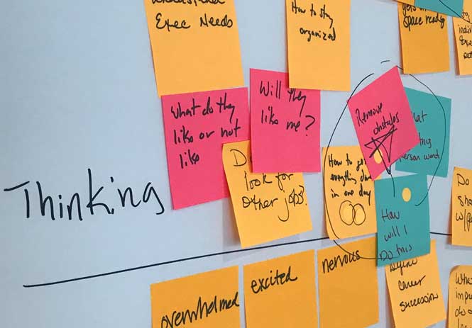Write one thought or feeling per sticky note. Place the sticky notes in the “Thinking” or “Feeling” swim lane, aligned under the relevant “Doing” step. You may find that this step is harder to do. That’s okay. Filling in this part of the journey map requires making some educated guesses about people’s cognitive process and emotional state.