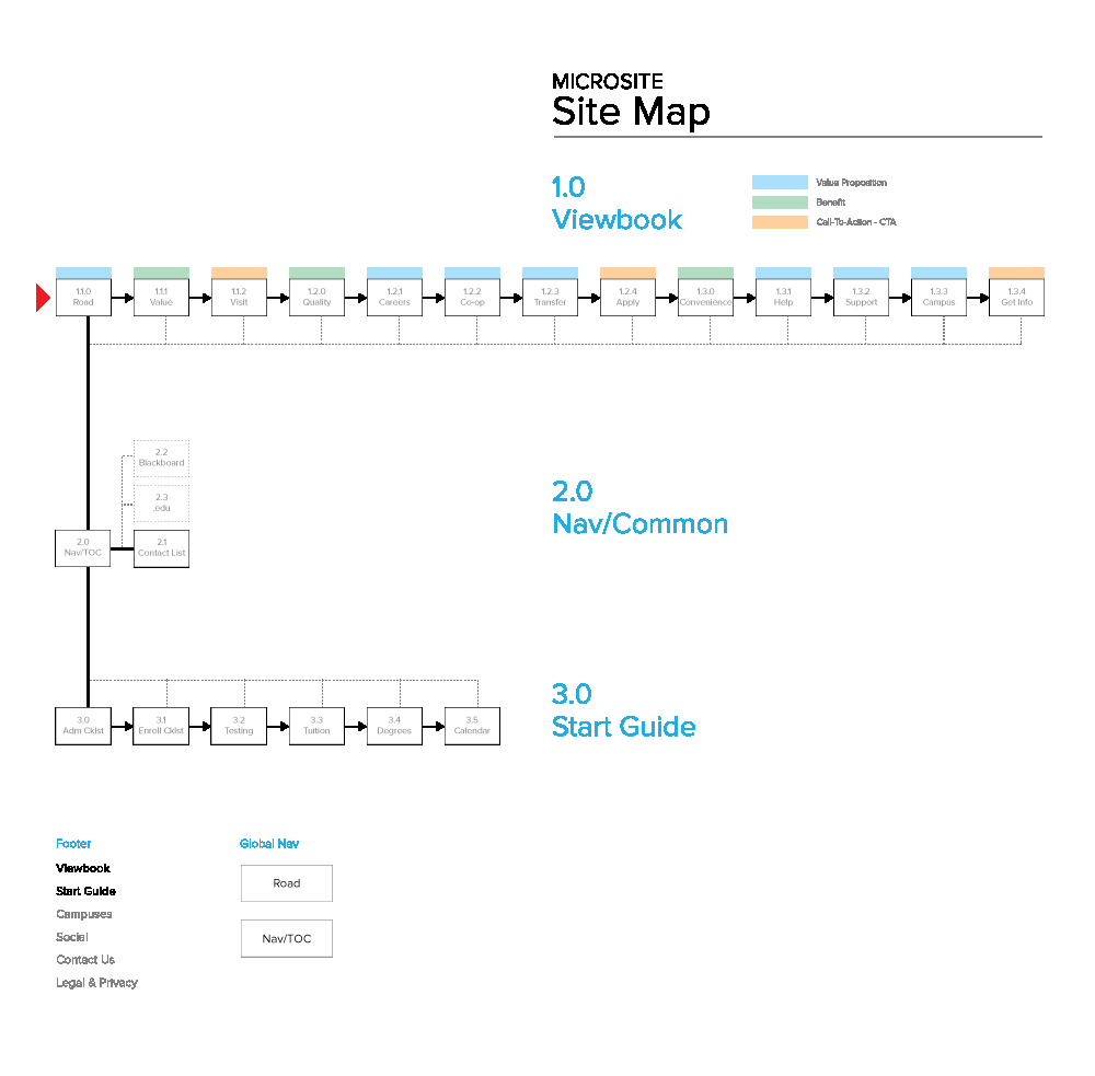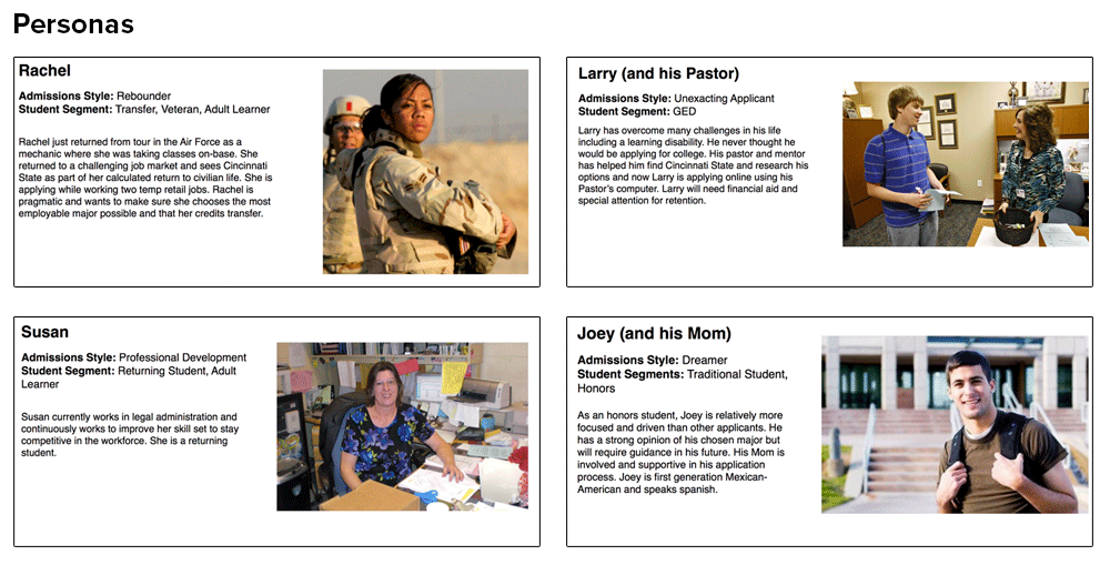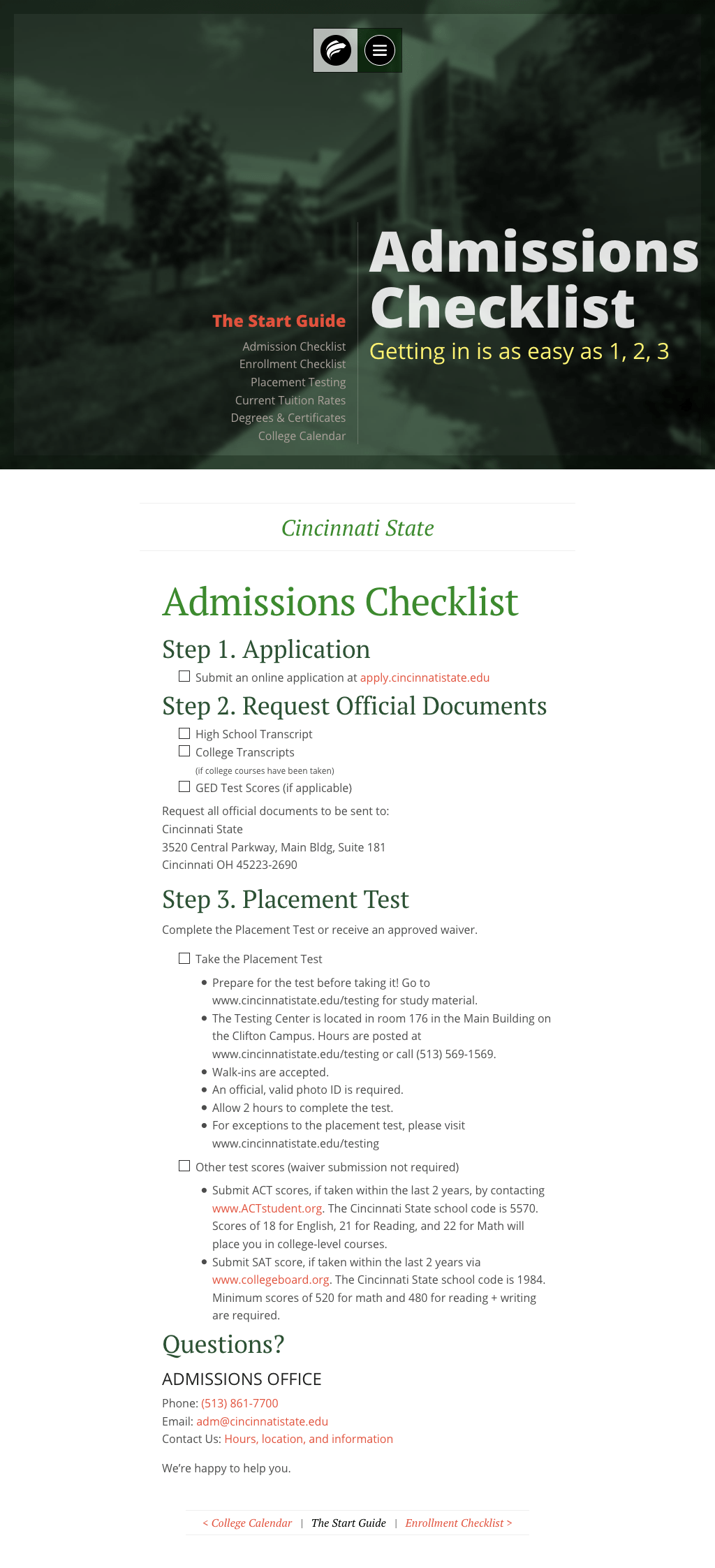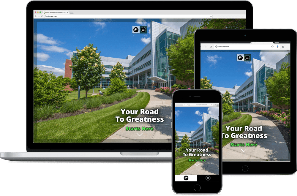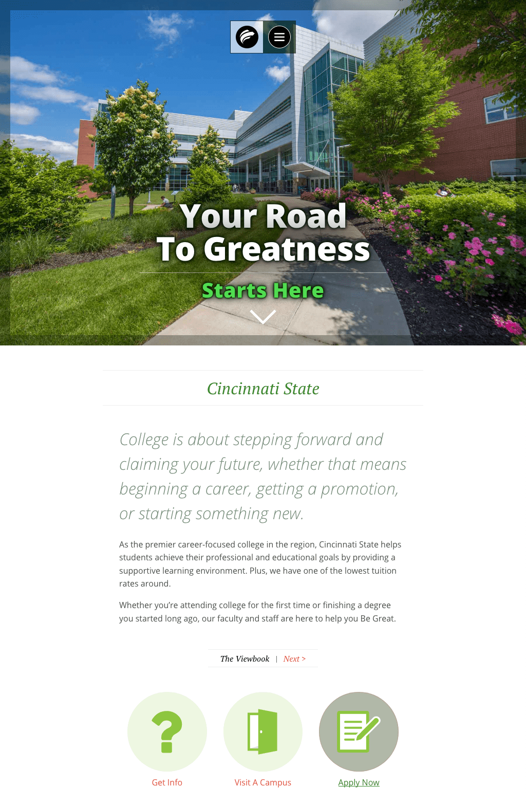 College Viewbooks are tangible leave-behinds expressing the college value proposition. But potential students consume content with mobile devices. The digital viewbook reaches the target audience with a marketing message to explore Cincinnati State in a digital context. The narrative goes through a three cycle narrative. Each cycle begins with a value proposition and ends with a call-to-action (campus visit, apply, and lead generation form).