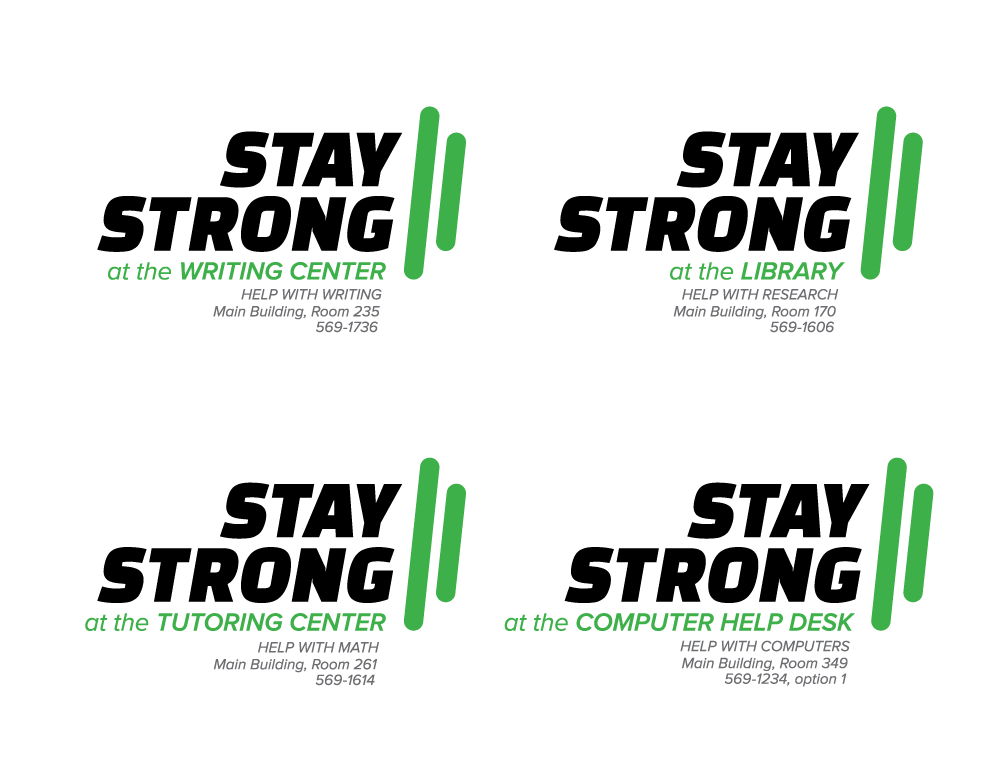 Student retention is an on-going challenge at a community college. Midterms and finals are an especially challenging time for students. The Stay Strong campaign encourages students to persevere and points them toward college services and resources that can help them succeed.