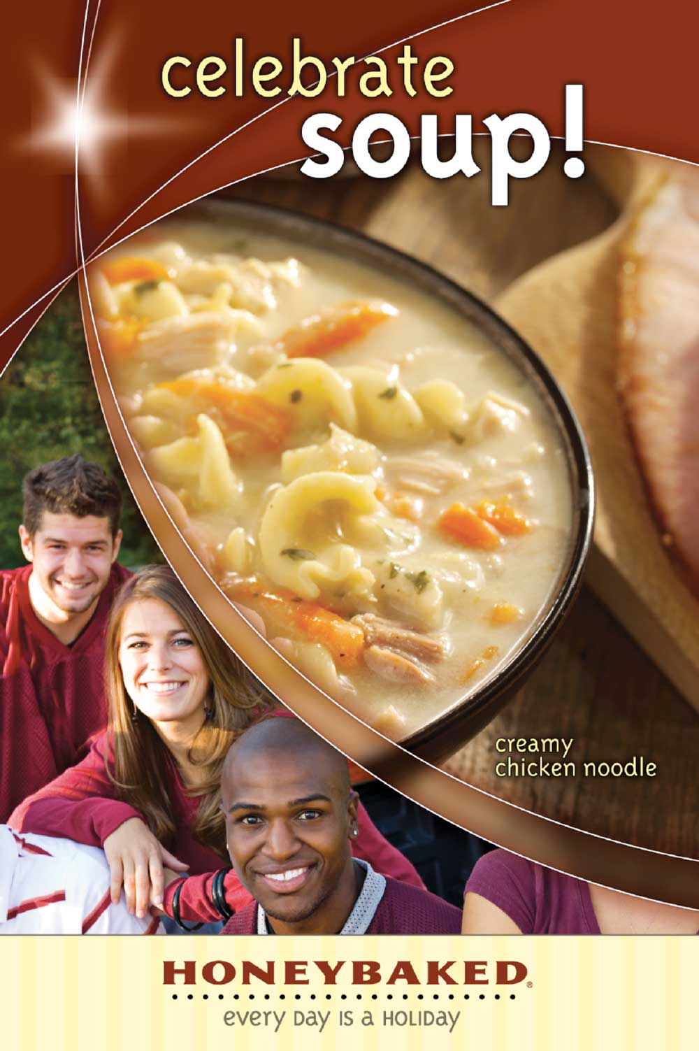 Honeybaked Ham wanted to introduce soups to their retail cafĂ© stores and grocery store partners. Created the tagline “Every Day is a Holiday” to address public perception of the Honeybaked brand as a holiday only purchase. The packaging reflects an upscale product wrap for convenient, microwaveable trays.